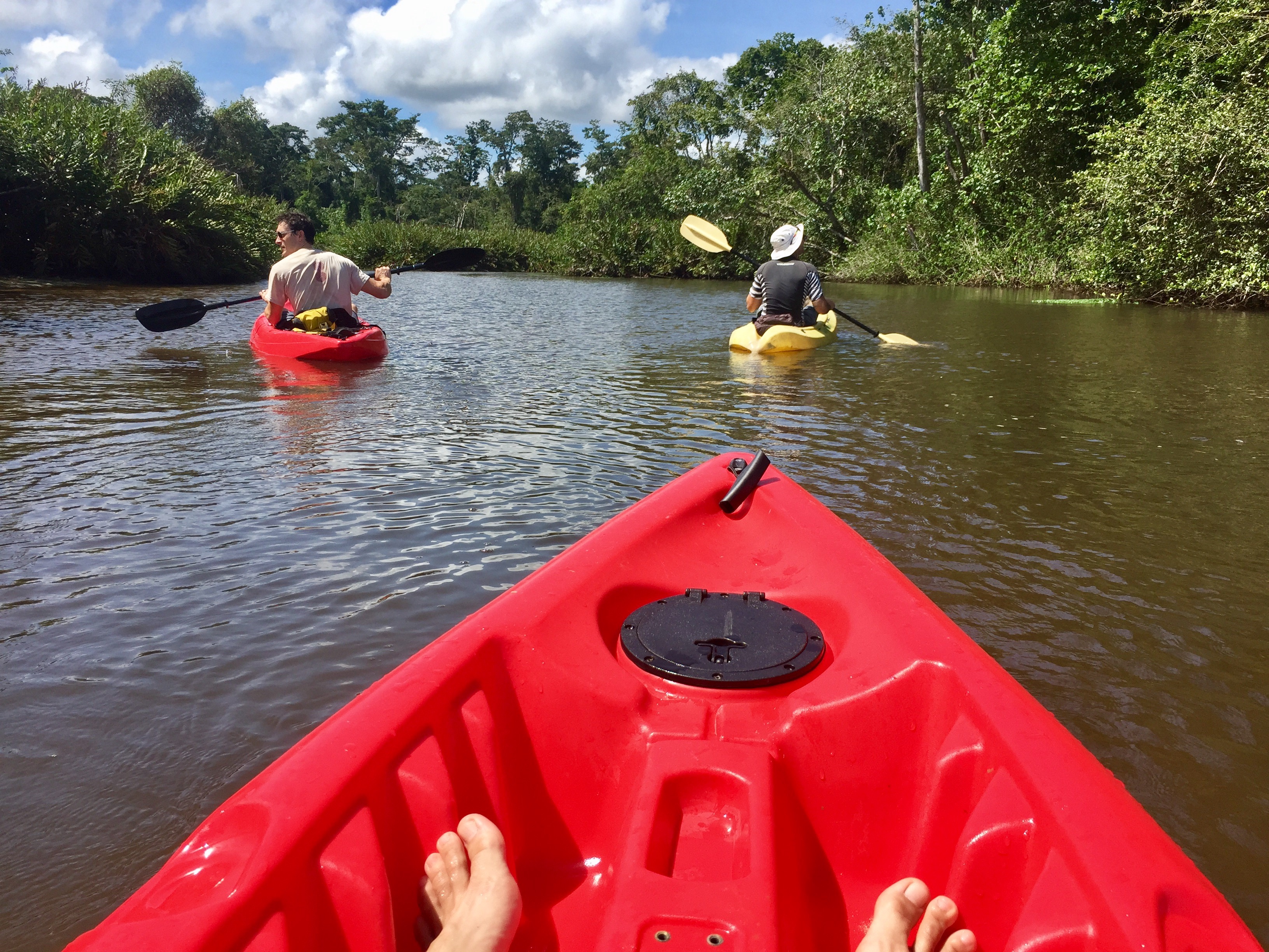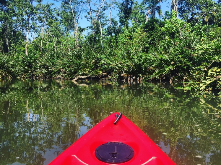 Ocean to river mouth, we kayak through a miniature break in the sand. Brown river, tainted by tannins from roots and decomposing leaves. The trees stop the wind and the sun bakes our skin. The red kayaks glow as we slowly make our way around the mangroves. I can’t even begin to imagine what lives in this water or within the thickets. Billy, our guide and good friend to Johnny, pointed out large, dark birds perched low to the water. There’s so much life in and around water – of course. But eerie things. This river path loops and curves around. It continues inland, but the foliage grows closer, narrowing the inlets. “You could get stuck,” Billy adds. I was drawn to exploring, but knew I’d probably regret it. “I’d do it if I had some sort of bubble around me,” I joke, concerning myself with spiders more than caimans (small alligators).