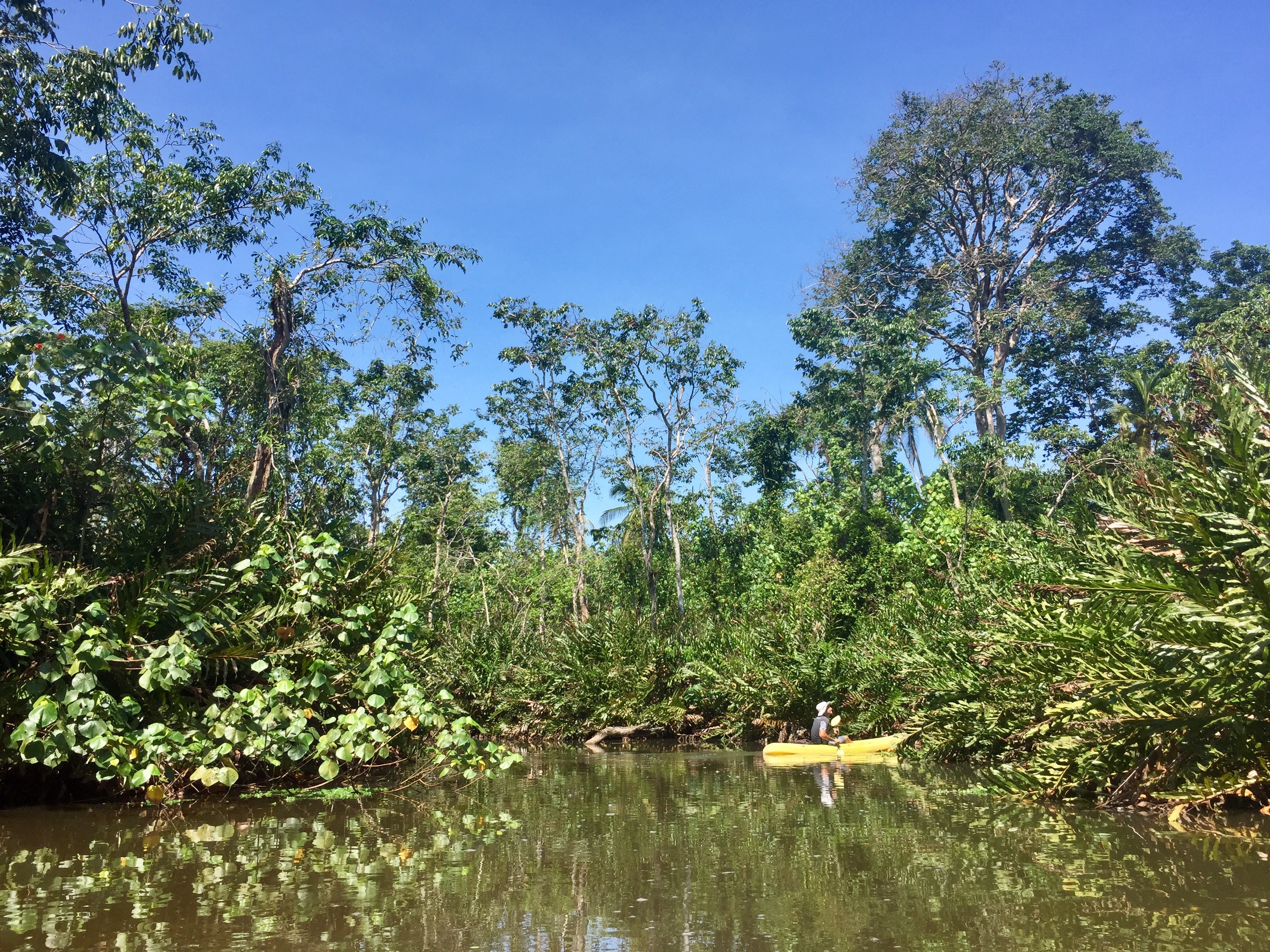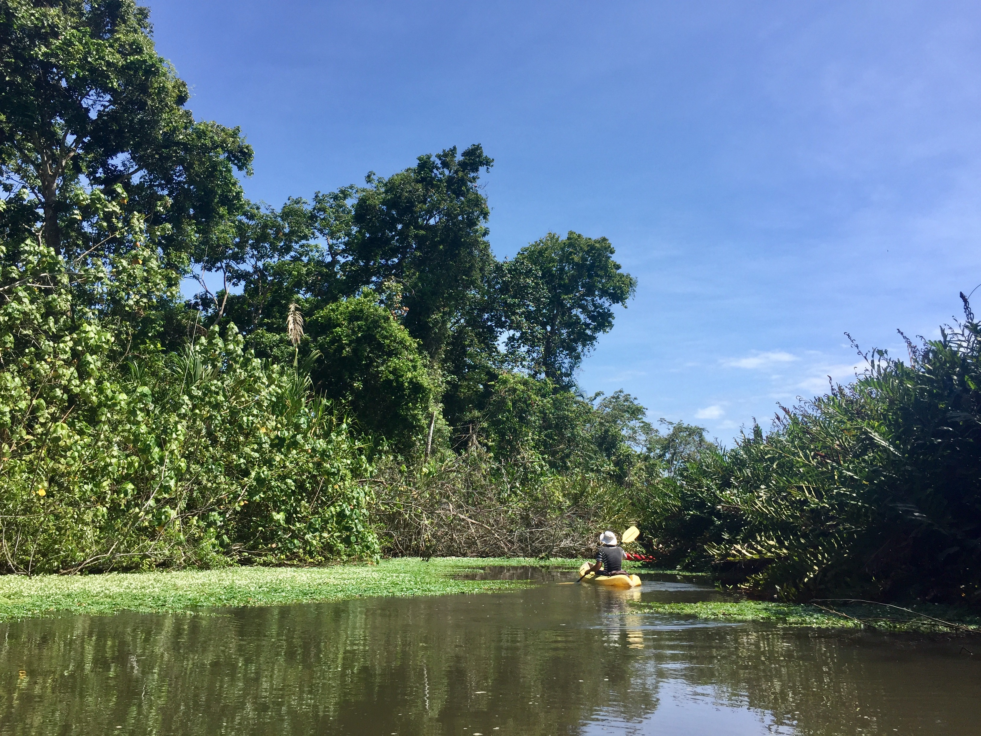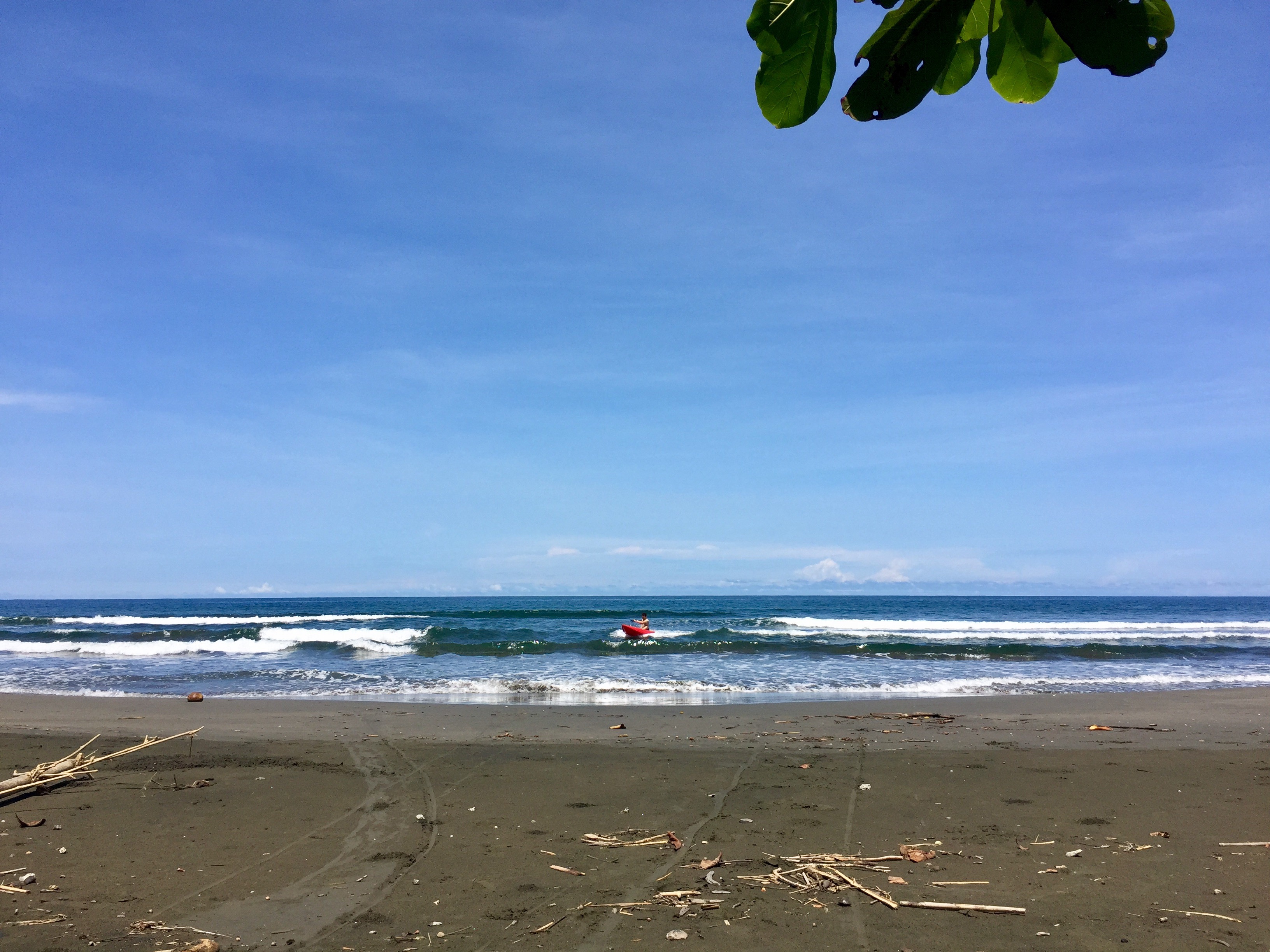 We beach our kayaks and devour a pineapple, then paddle back out into the ocean. We take our time, as our arms are not used to this motion. We cross the coral reef, schools of fish – silver jewels glancing by. The sun pierces deep water in long spears. Billy strings out a fishing line and trolls it behind him, keeping the line between his teeth as he paddles. He catches a fish. Two men are diving and catching lobsters, their dark heads bobbing and disappearing, showcasing a stark familiarity with the sea. We make it to Playa Negra, a black sand beach, with a small break. Patrick gets excited and tries to surf his kayak. Succeeding, he paddles back out for more. I give it a try, and satisfied with my one ride I get out to pull the kayak onto shore, but a wave hits broadside and flips my kayak over and onto me, bruising my knee. I’m quick to recover and drag it out, extremely grateful for having a dry bag for my phone.