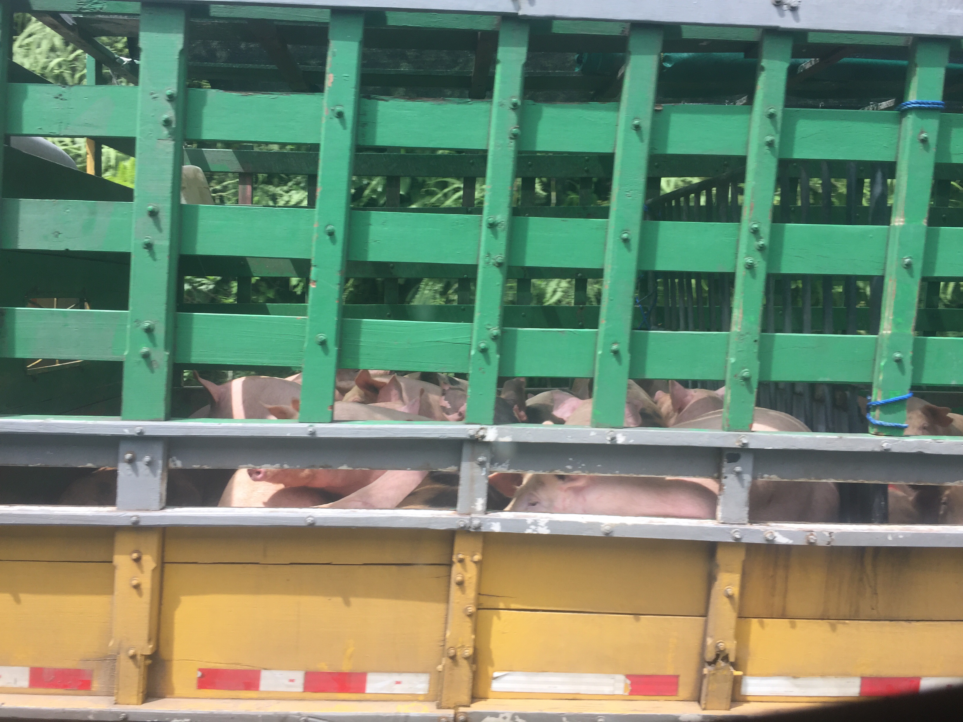 “It smells like shit,” Johnny cringes. “It’s pig shit,” Patrick says, and sure enough our bus driver passes a truck filled with pigs. I was impressed, but I knew that Patrick used to work on a hog farm. The bus driver puts the pedal to the metal once again to pass a slow semi-truck in the right lane. We’re in the designated passing lane, but a sedan appears to our right, trying to beat us to the punch. Suddenly we’re splitting the lane for oncoming traffic. The sedan thought it was a good idea to try and squeeze in-between us and the semi. I’m sure the sedan was horrified with his decision, though, with two large vehicles inches away from either side of his car. The sedan makes his way out and pulls over. The bus stops, too, and the driver scans the side of his bus for damage, but sees nothing. He scolds the sedan and then blasts off to make up for lost time.