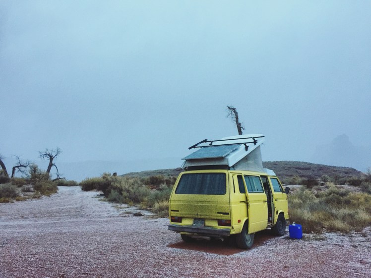 The van is a cozy niche. Clouds cross the steep buttresses; they shadow and pencil the stones of our eyes. Snow flurries come in waves and change this desert place. Always wind. It’s cold but our clothes keep us on the edge of warmth. We are enough. It is enough. Our bodies still talk of rest. My ankles ache. I heard my heart beating today, loudly, as I tried to lead a thinning crack. This is harder than it should be, I thought. I chose to ignore the pounding. I hate hearing my own heartbeat.