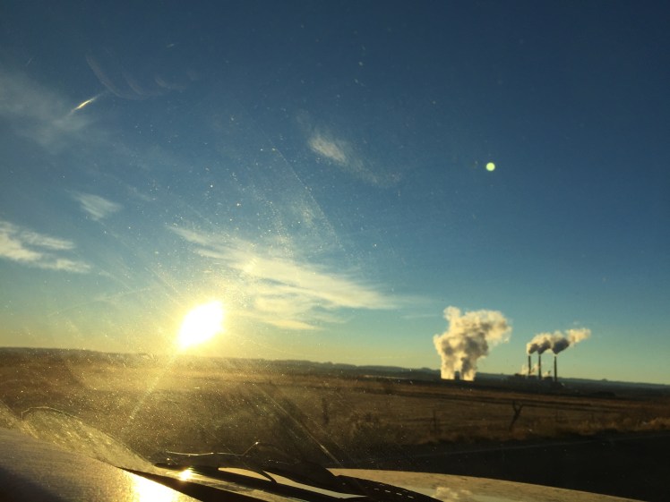 We arrive and pass through Ferron, Utah and Christmas lights drape windows and the roofs of large family homes. Smokestacks from the local coal plant flash their lights and spew billowing carbon emissions every Goddamned day and night.