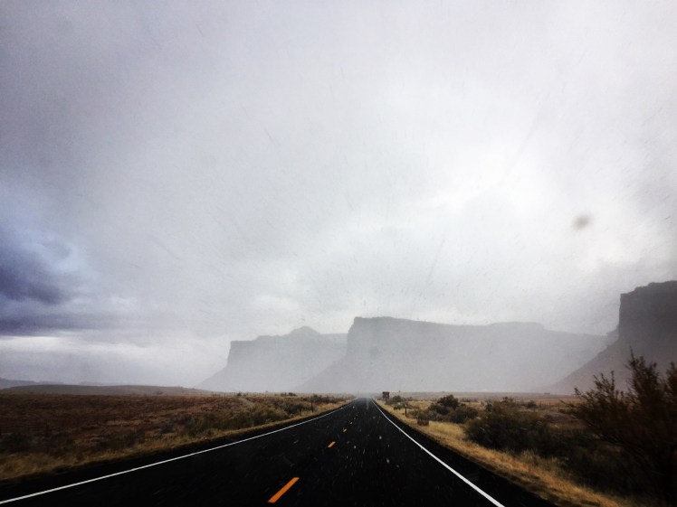 Our tires break apart the slush. We shower at the Lazy Lizard, dine for breakfast. Eat a lot of hashbrowns. Briefly trot around Arches National Park, once Puebloan and Shoshonean land. Drive North-West. Purple and red, orange and blue, the sun stains my eyes and the clouds break the skyline apart. Painterly landscapes buzz by, the music hums with the wheels. The glare of sunset reflects off the hood of the Jeep. It turns us orange, turns us deep. Goodbye desert and sandy cliffs, all ever-connecting, older and wiser than the humanity that grips the earth by the collar and shakes coins from pockets. Petrified sand dunes are proof of transient states, how impact and heritage are everlasting.