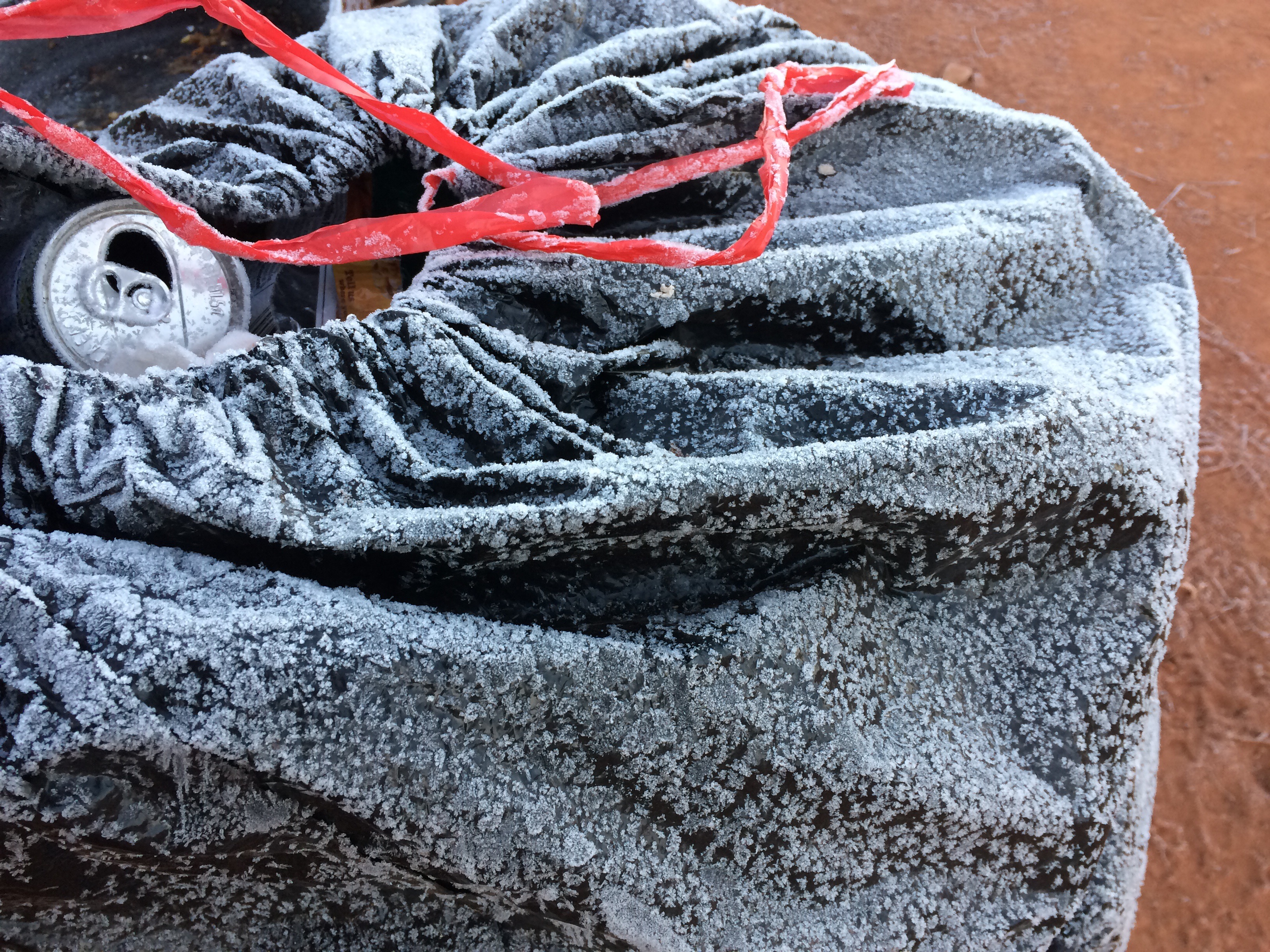 The sun is a clear disk rising over the chaos. Beer cans lie about the fire ring, most of them half-full and frozen. The pots and pans are as they were, left for the stars to lick leftovers with frost. The turkey lies stiff in its foil pan, an old carcass you’d find ravaged in the winter backwoods of Alaska. I quickly pick up all the trash I can and tidy our gluttonous wave of being. We are poor dirtbags again, aching and sore. Everyone slowly rises to peer, drearily, into their cooling coffee, the steam glancing their faces with warm fingers.