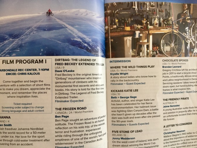 Everything dims. The festival trailer alone for the whole weekend makes my heart swell and my eyes shine in the dark. I see Sonya wipe her eyes. Filmmakers speak about their pieces, Chris Kalous emcees, and we watch like starving artists at the table of input and inspiration. Films on freediving, trail running, Fred Beckey, Ben Page and his solo bike trip through the Canadian Arctic, Krystle Wright’s compilation of female badassery, river activist Katie Lee, jockeys, a one-eyed surfer, and a letter to Congress for wilderness conservation written back in 1960. The night ends with a spoken word piece by Wade Newsom.