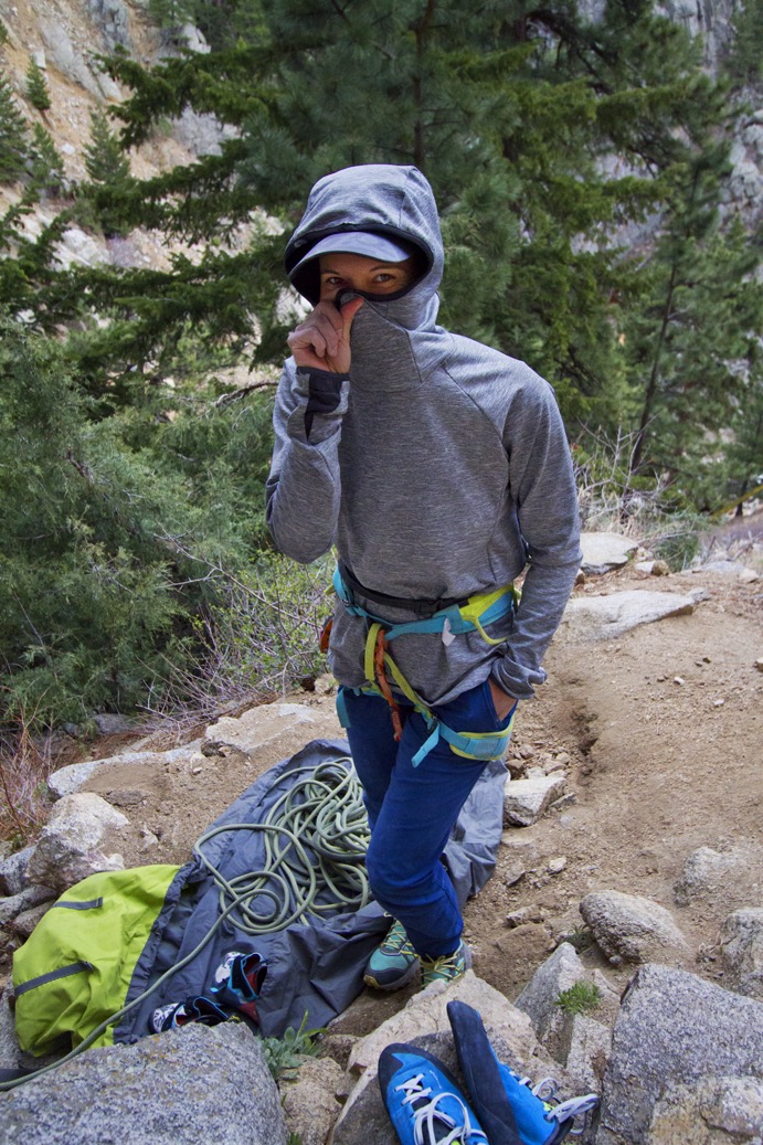 The first weekend I had it my husband and I hiked down into Dream Canyon. The morning was brisk but the hoodie was all I needed for the trek to the Plotinus wall from Upper Canyon, which entails a steep descent, a few river crossings, and mild scrambling. It was one of those days where the weather was either sunny or on the brink of rain. Thankfully, I didn’t have to don and doff the hoodie as it regulated my core temperature very well; and even when I started to sweat on the hike down or while climbing, it breathed well enough to not get sticky or overbearing. On the hike out, I even purposefully wanted to get my sweat on to see if it would smell after one full day of use. It passed without a trace of odor and I left it on while I slept in my sleeping bag that night to see how it would fare rolling around in. In a strange way, you almost forget you’re wearing a sweater, it’s so comfortable.