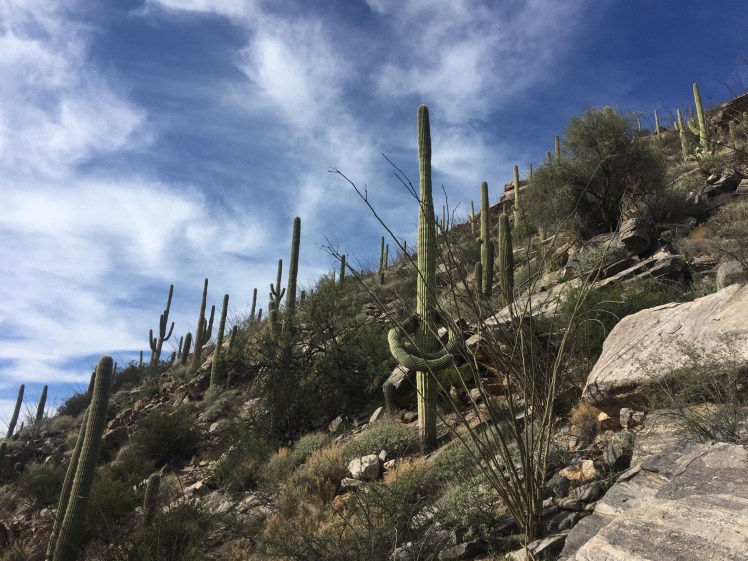 With every switchback and spin of the heels, I can’t believe how much water must exist across this land, so thoroughly tucked into every prickly plant and slow-bursting seed. I continue upwards along the narrow trail—a sliver of benign space between swaths of rich and thorny cholla, ocotillo, eagle claws, prickly-pear, pincushion cacti; and between every cactus is a paloverde tree, creosote bush, yucca plant, wild sage, agave, hierba del vaso with its brittle stems and yellow flowers.